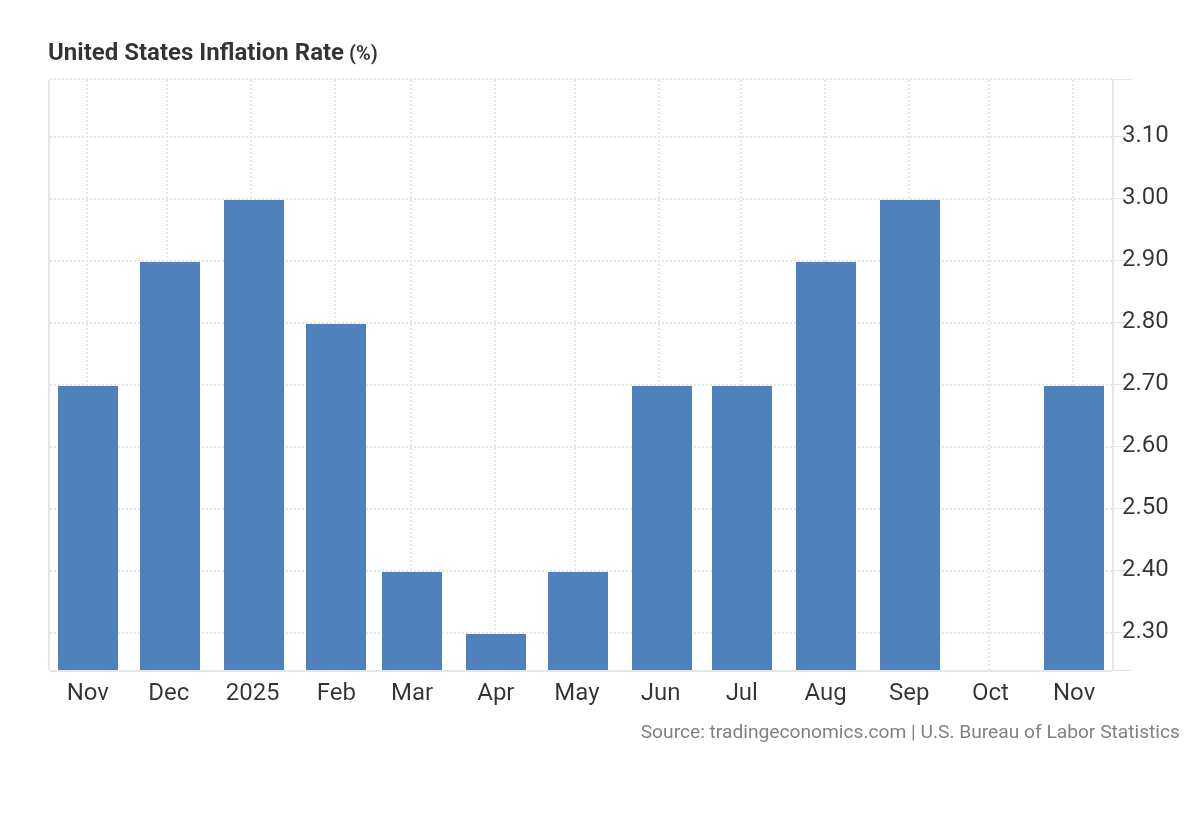 Lạm phát hàng năm tại Mỹ trong tháng 11 đã giảm xuống còn 2,7%, mức thấp nhất kể từ tháng 7, thấp hơn đáng kể so với mức 3% của tháng 9 và cũng thấp hơn dự báo thị trường là 3,1%.